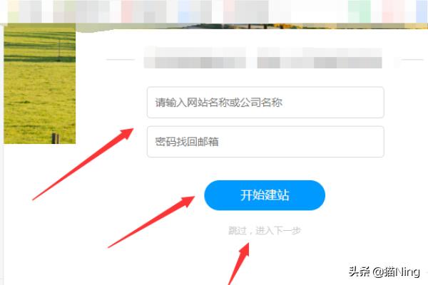 5、下一步中可以输入网站名称或者公司名称和密码找回邮箱,点击开始建站,如果没有或者不想填写直接点击跳过,进入下一步。
