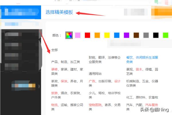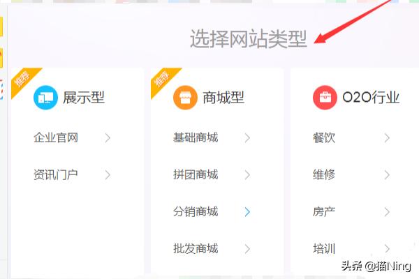 6、接着选择网站类型,比如你做餐饮的就选择餐饮并在弹出列表中选择分项。